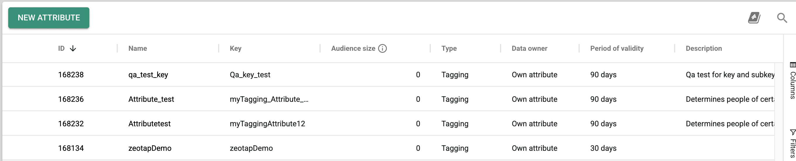 The Attribute ID and Key Name are used to add a Sub-key to a Key in Zeotap. To obtain them:- Go to the Audience section in your Active Agent instance. Look for the Key under which you would like to add the sub-key. Once you have it, note down the key’s Key, and ID in the respective column.
