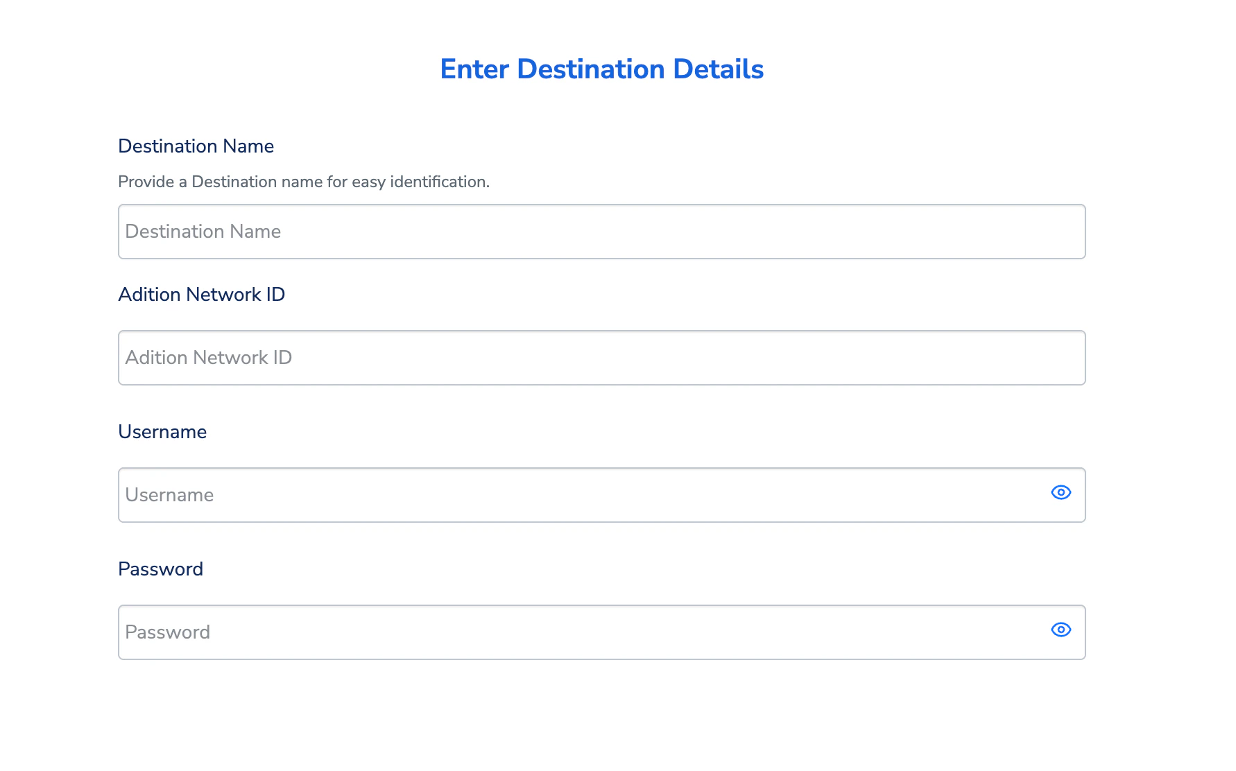 Once you have obtained the prerequisites mentioned in the above section, perform the following steps to create a Destination for Active Agent:Click Active Agent. A screen appears displaying details about the particular destination towards the left. On the right-hand side of the screen, find a list of fields that are required for the integration to be established. Enter the required details as mentioned in the following steps:a. Enter a name for the Destination.b. Enter the Adition Network ID, Username and Password.