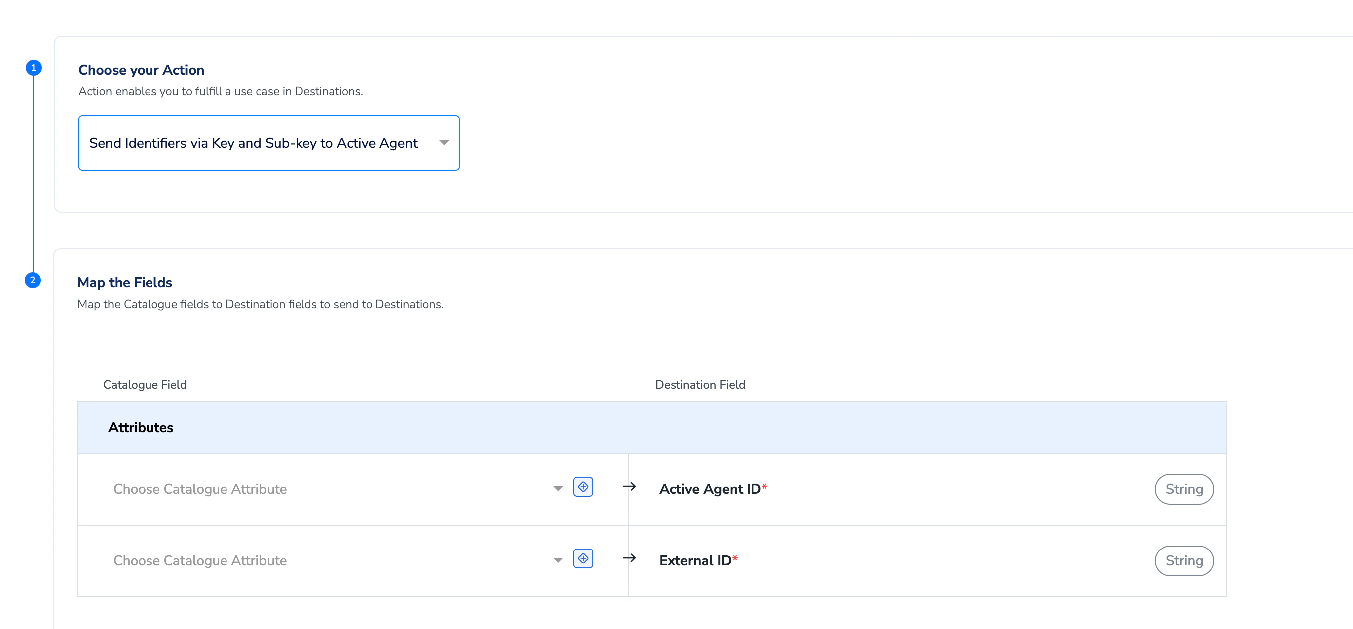 On the Action and Mapping screen, select from Send Identifiers via Key and Sub-Key to Active Agent or Send Identifiers via Sub-key in Active Agent as the action. Then, map the Catalogue and Destination fields accordingly.The following fields need to be mapped:a. Active Agent ID — This can be MAID or Active Agent Cookie.b. External ID — You can send ID5 or any other IDs in this field. Reach out to the Active Agent POC to get a list of all the IDs that are supported by Active Agent.