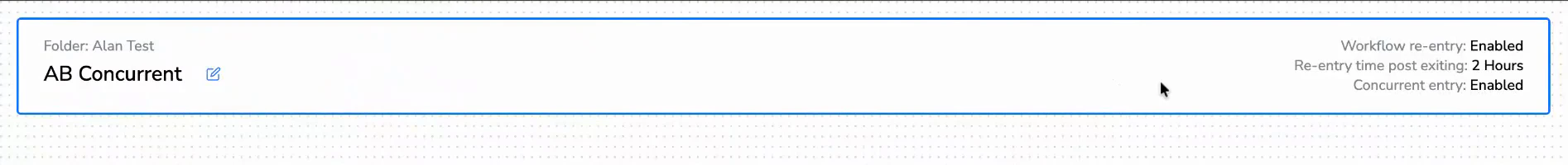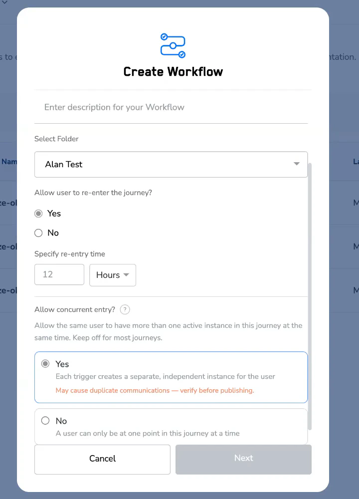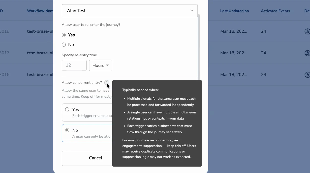 | Access on a new journey | Click Create Workflow → set re-entry to Yes → the concurrent entry field appears |