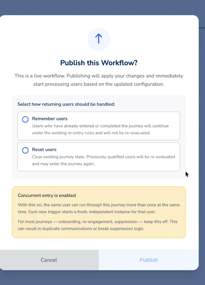 Concurrent entry is a journey setting that controls whether the same user can be active in a journey more than once at the same time. By default this setting is off. A user can only be at one point in a journey at a time, which is the correct behaviour for most journeys. Enable concurrent entry only when you have a specific need for multiple independent instances of the same user to run through the same journey simultaneously.How it works