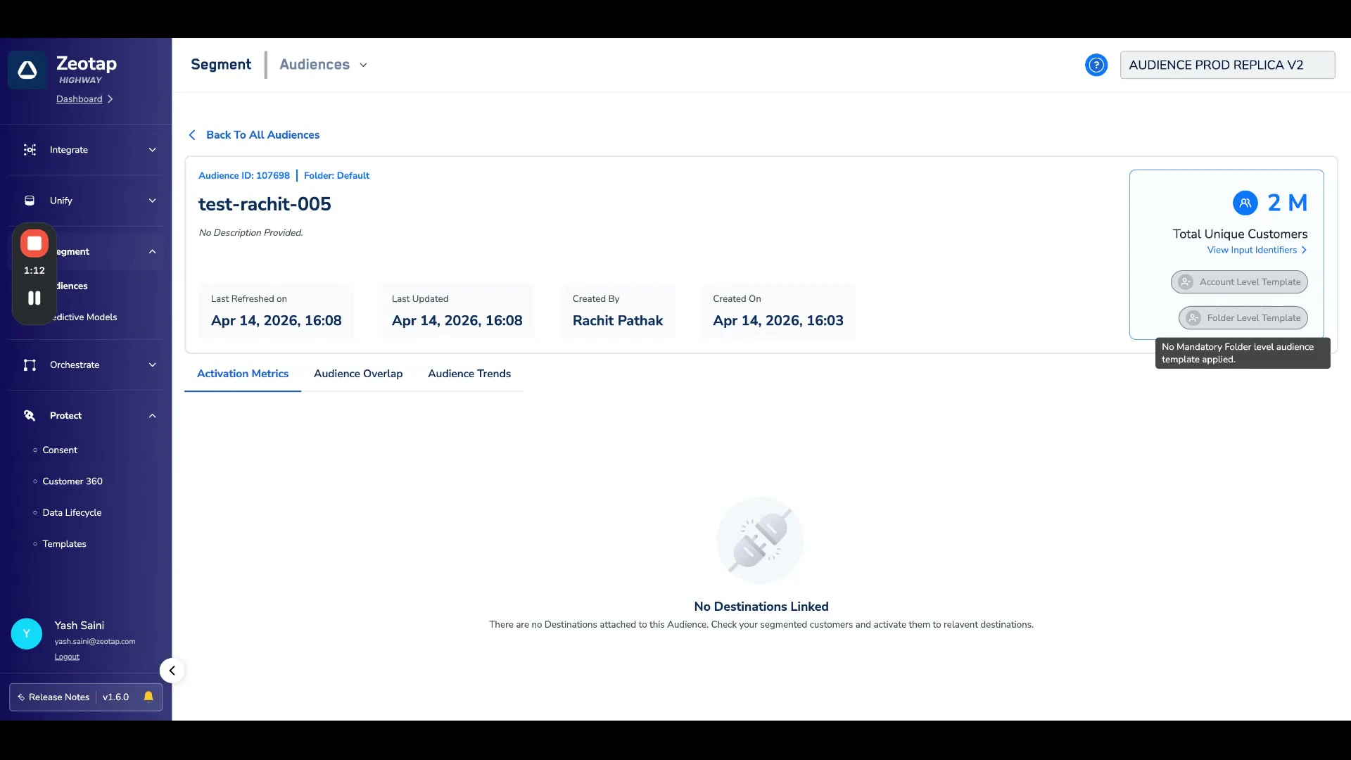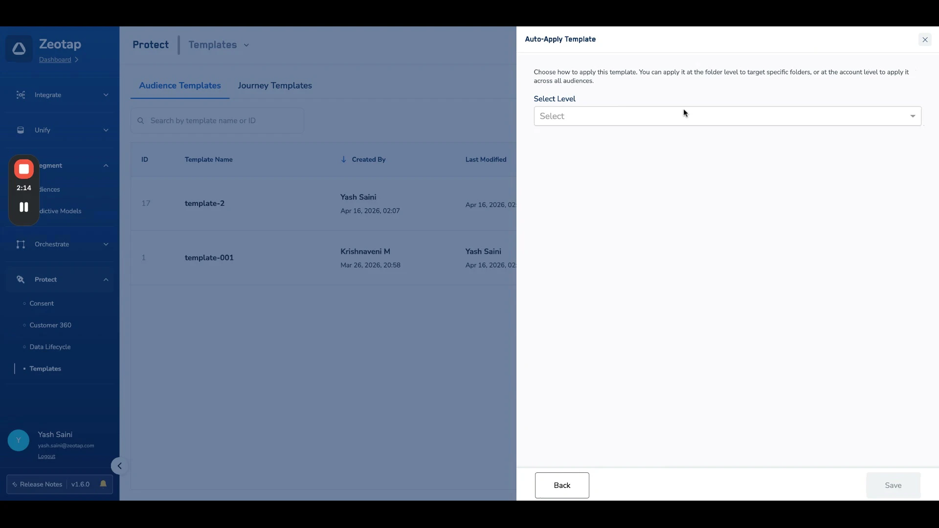 Auto-apply ensures the template is automatically attached as a top-layer condition to all existing and future audiences within the selected scope. There are two auto-apply options:- Apply at Folder Level — Automatically applied to audiences created in selected folders. Every audience in the chosen folders will follow the same standard rules.