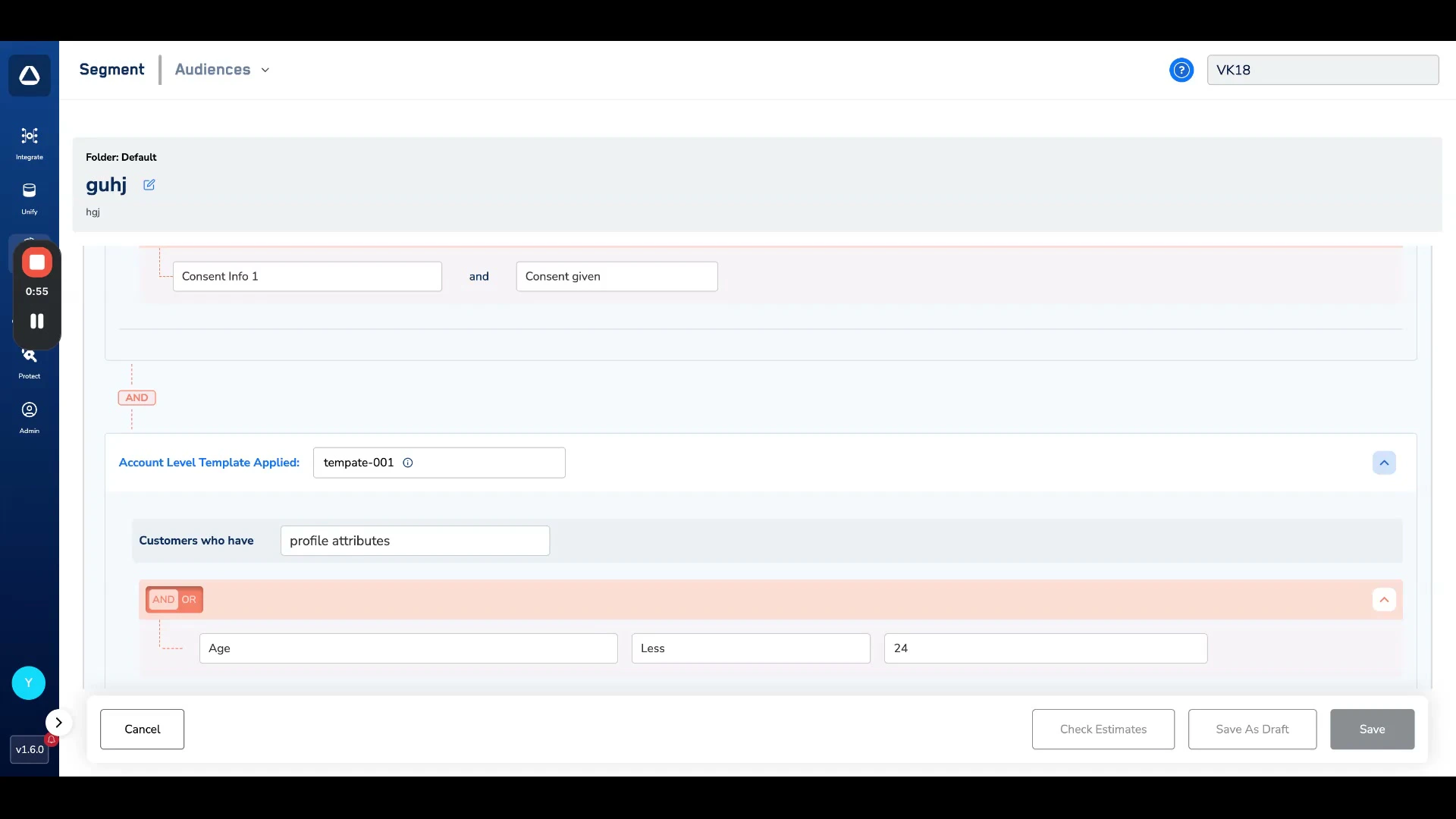 Auto-applied templates (folder-level and account-level) are also visible in the audience builder. These act as baseline conditions ensuring the audience complies with predefined standards.